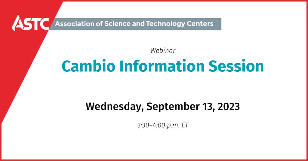 This webinar is co-hosted by ASTC and the Association of Children’s Museums (ACM). You will learn how to apply for our final cohort, including application tips and a live Q+A. Cambio—meaning “change”—aims to advance equity starting with museums’ capacity to support Latinx participation in STEM. They offer a yearlong, funded professional development experience brought to you by the Exploratorium and CCLI (CDM, ASTC, ACM, and Garibay Group).