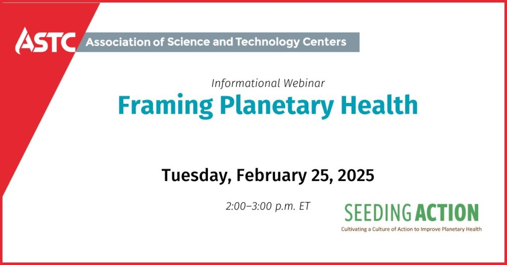 Planetary health issues like climate change, biodiversity loss, and pollution have always posed communication challenges. As extreme weather events increase, the policy landscape evolves, and public views and discourse shift, we have an opportunity to update our communication approaches to meet the moment. Join Seeding Action for a webinar on framing planetary health. This webinar will cover evidence-based suggestions and considerations for crafting messages that invite productive conversations and inspire action. Featuring examples from science centers and museums, the webinar will provide new ideas and sources that attendees can bring back to their work in exhibits, programs, marketing, and beyond.