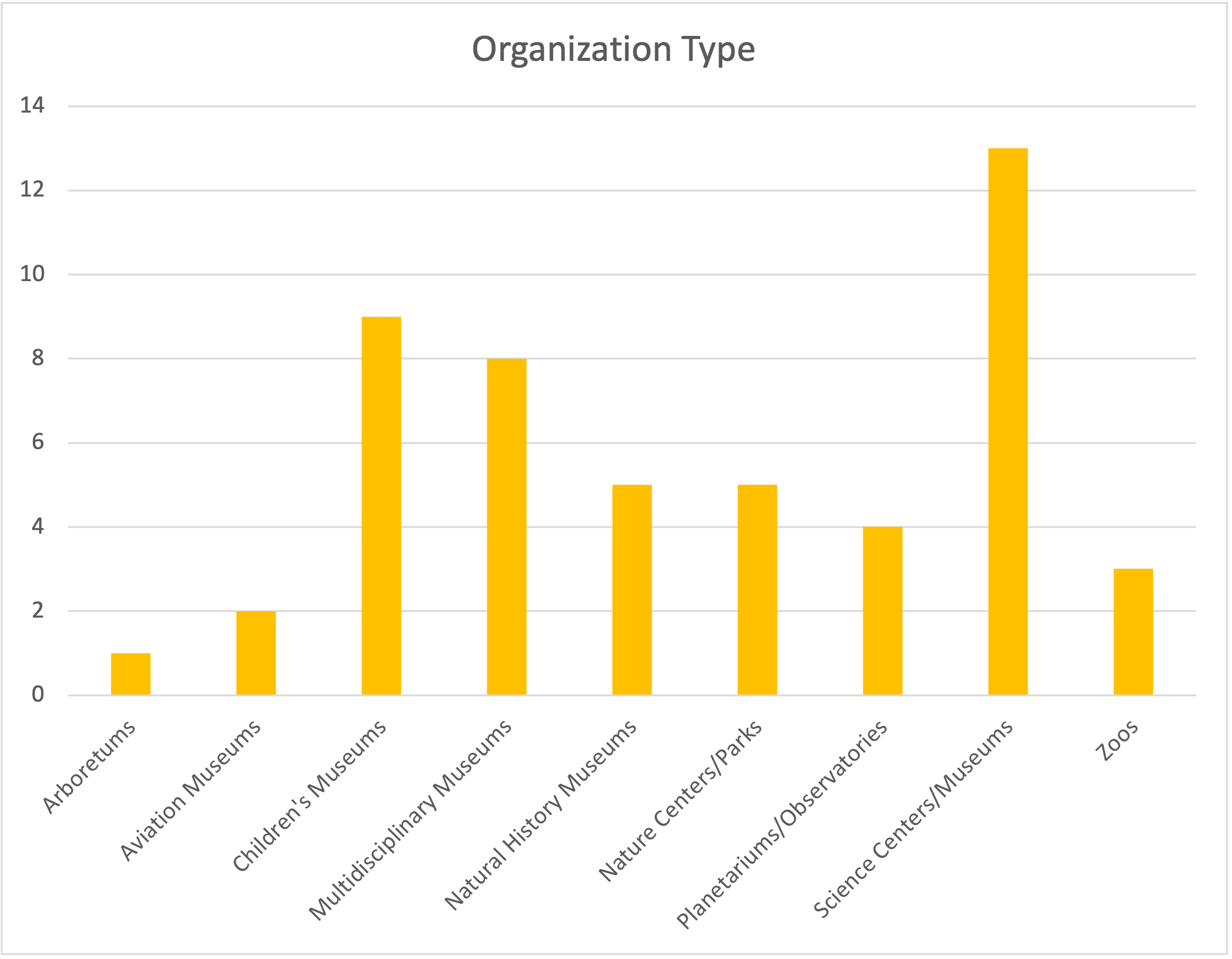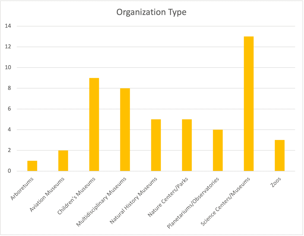 What they all have in common is that science is central to their educational mission, operations, and programming. They included children’s museums, multidisciplinary museums (two or more significant disciplines), natural history museums, nature centers/parks, planetariums/observatories, science/technology centers, aviation museums, zoos, an arboretum and one historic Frank Lloyd Wright house!